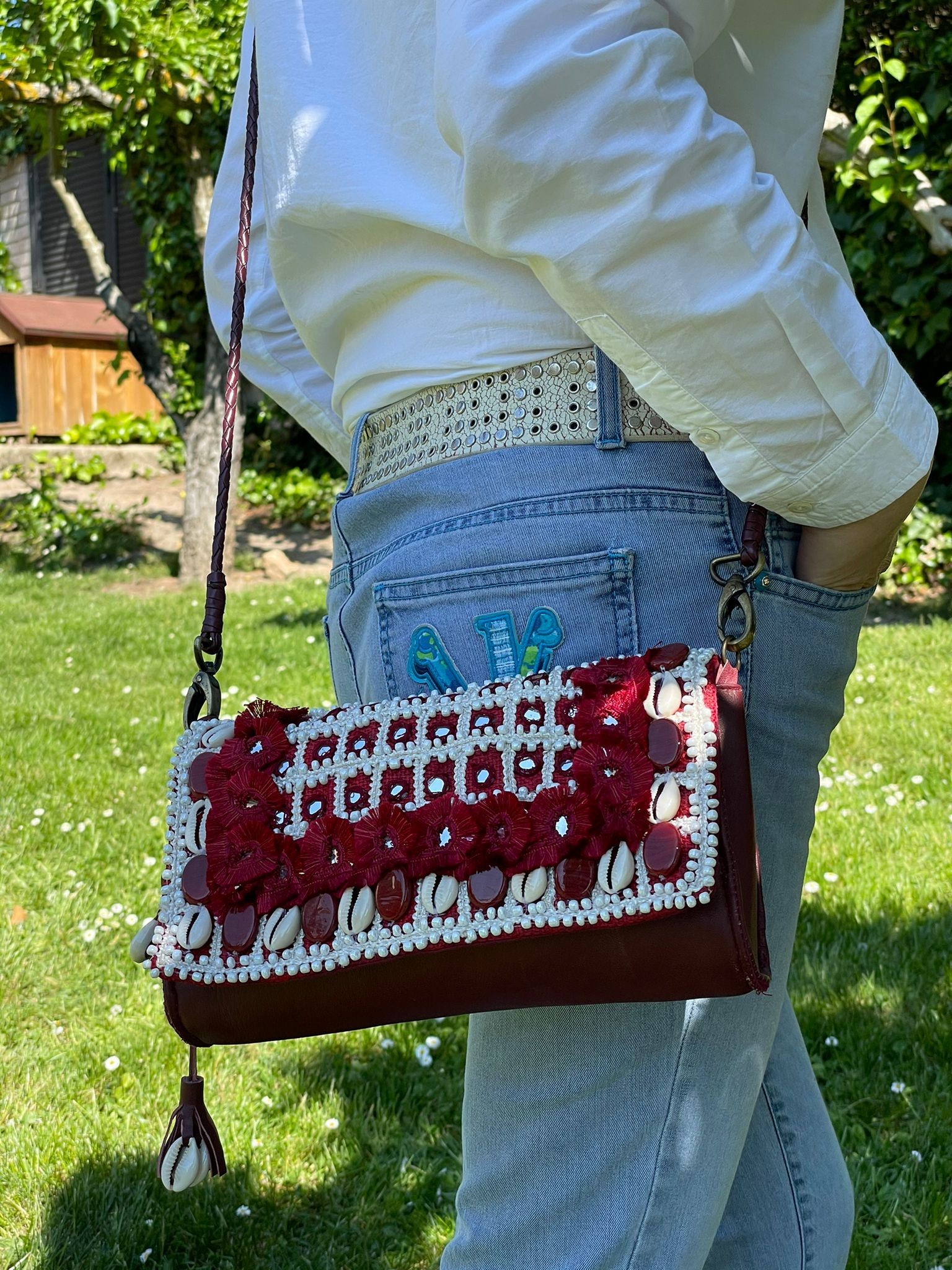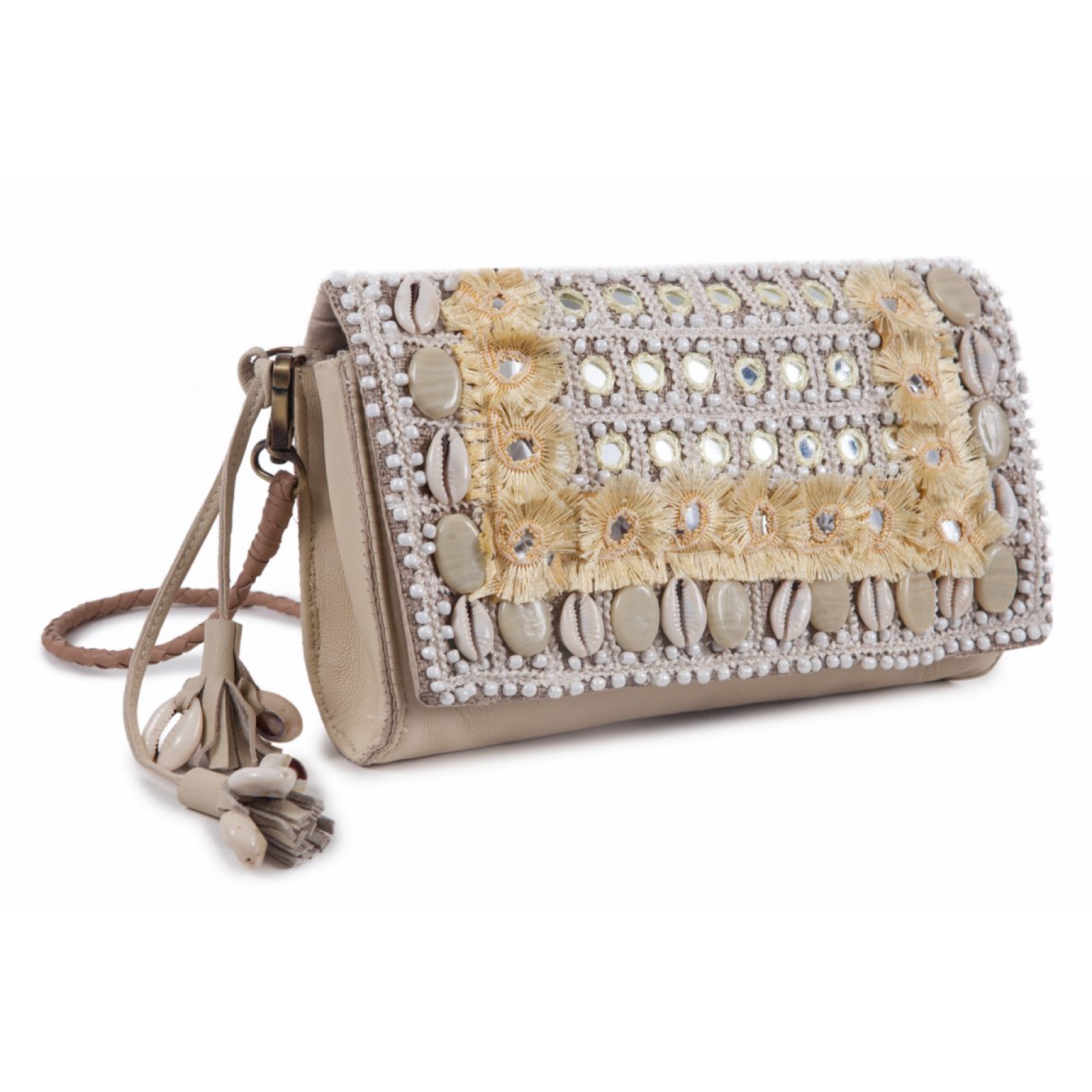 Bandolera con solapa adornada con conchas, elaborada a mano con materiales de alta calidad.
