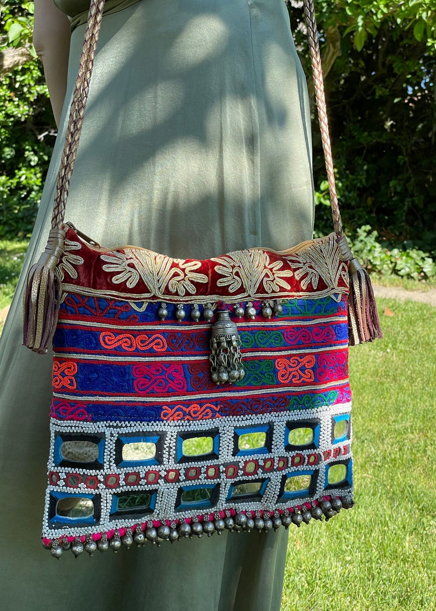 Bandolera de tela étnica con detalles en piel, confeccionada de manera artesanal.