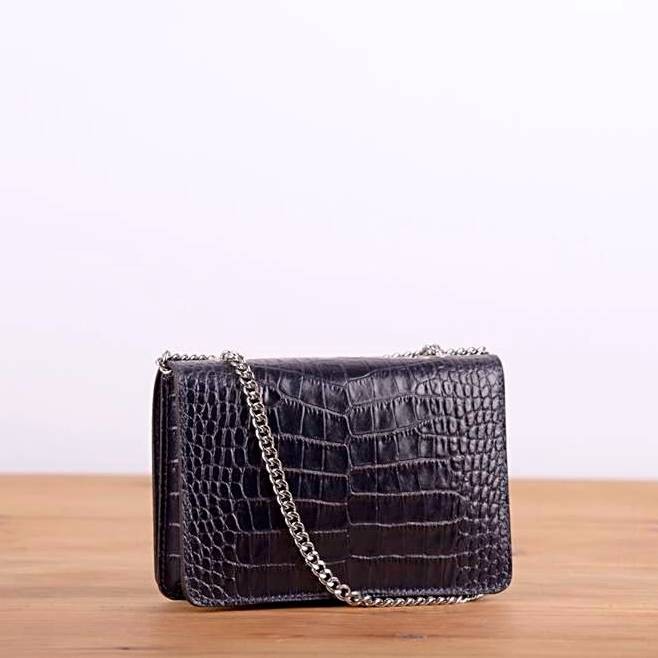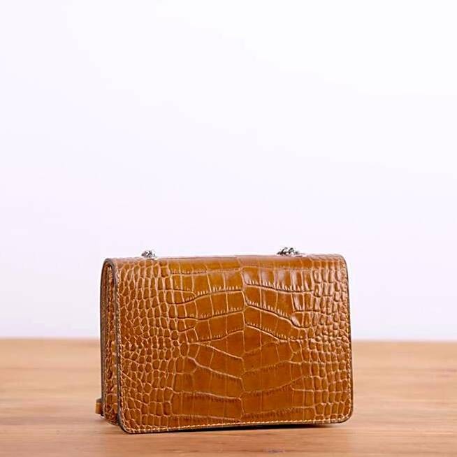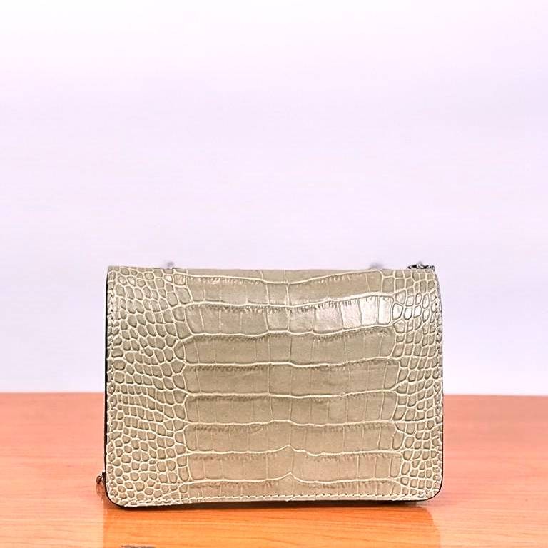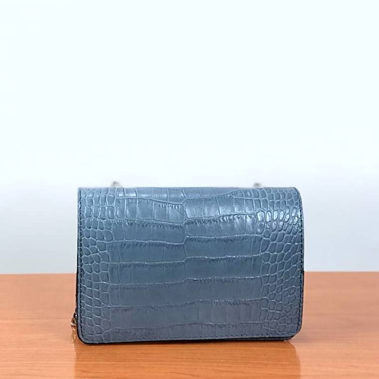 Su elegante diseño presenta un estampado en tonos sólidos y un sutil relieve que simula la textura de la piel de cocodrilo.