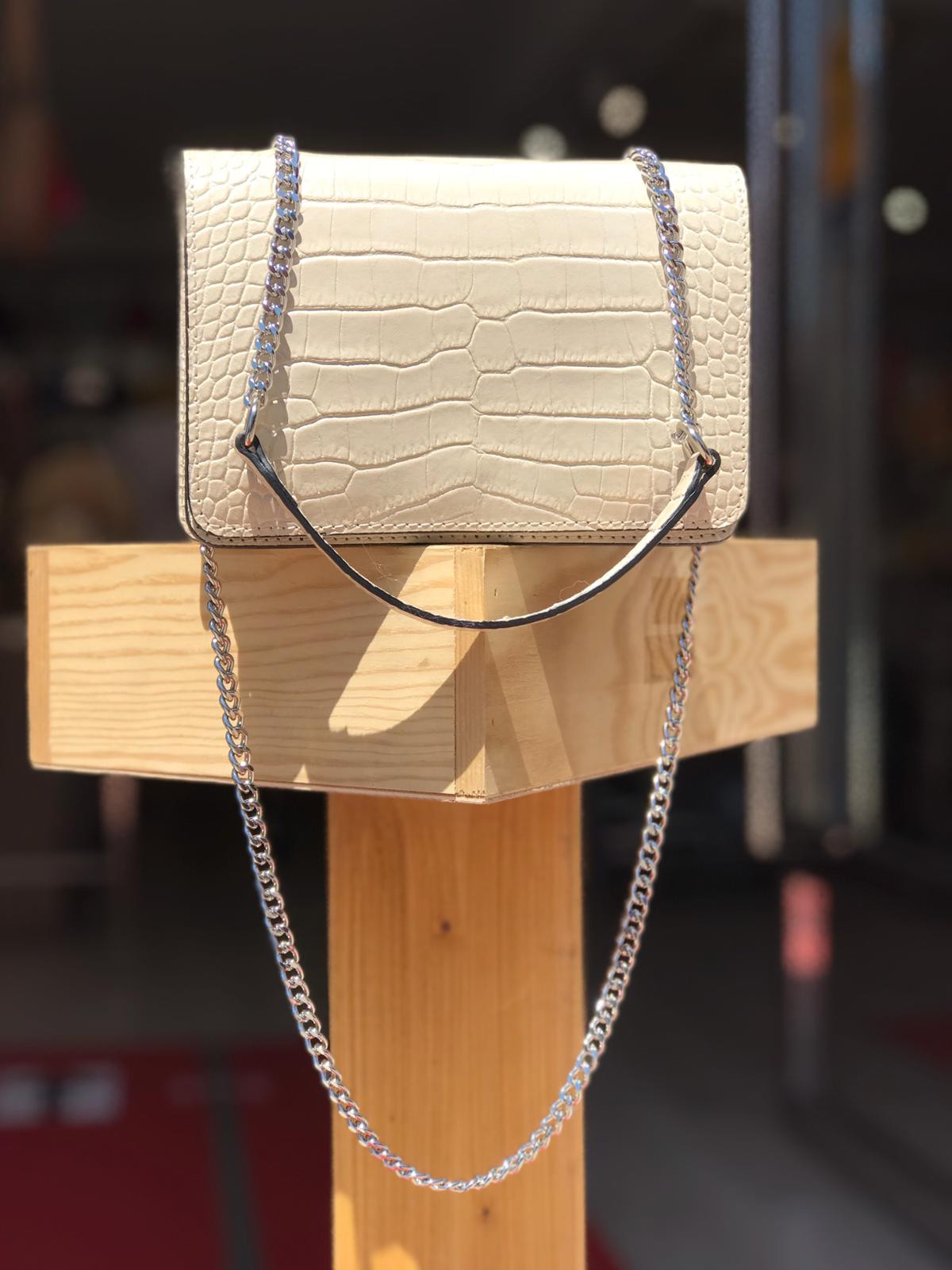 Este exclusivo bolso cuenta con un asa metálica adornada con una cadena y detalles en piel, así como un práctico cierre magnético para mayor seguridad.