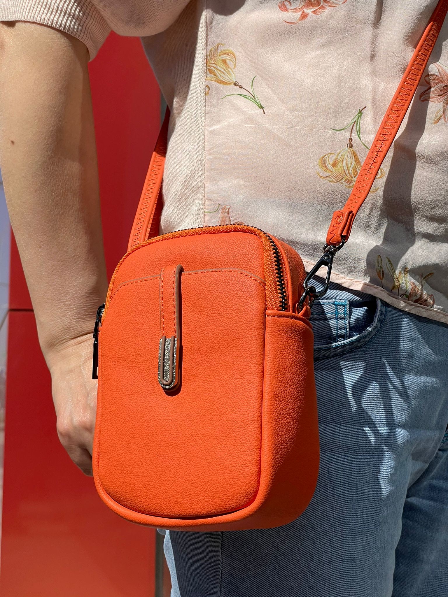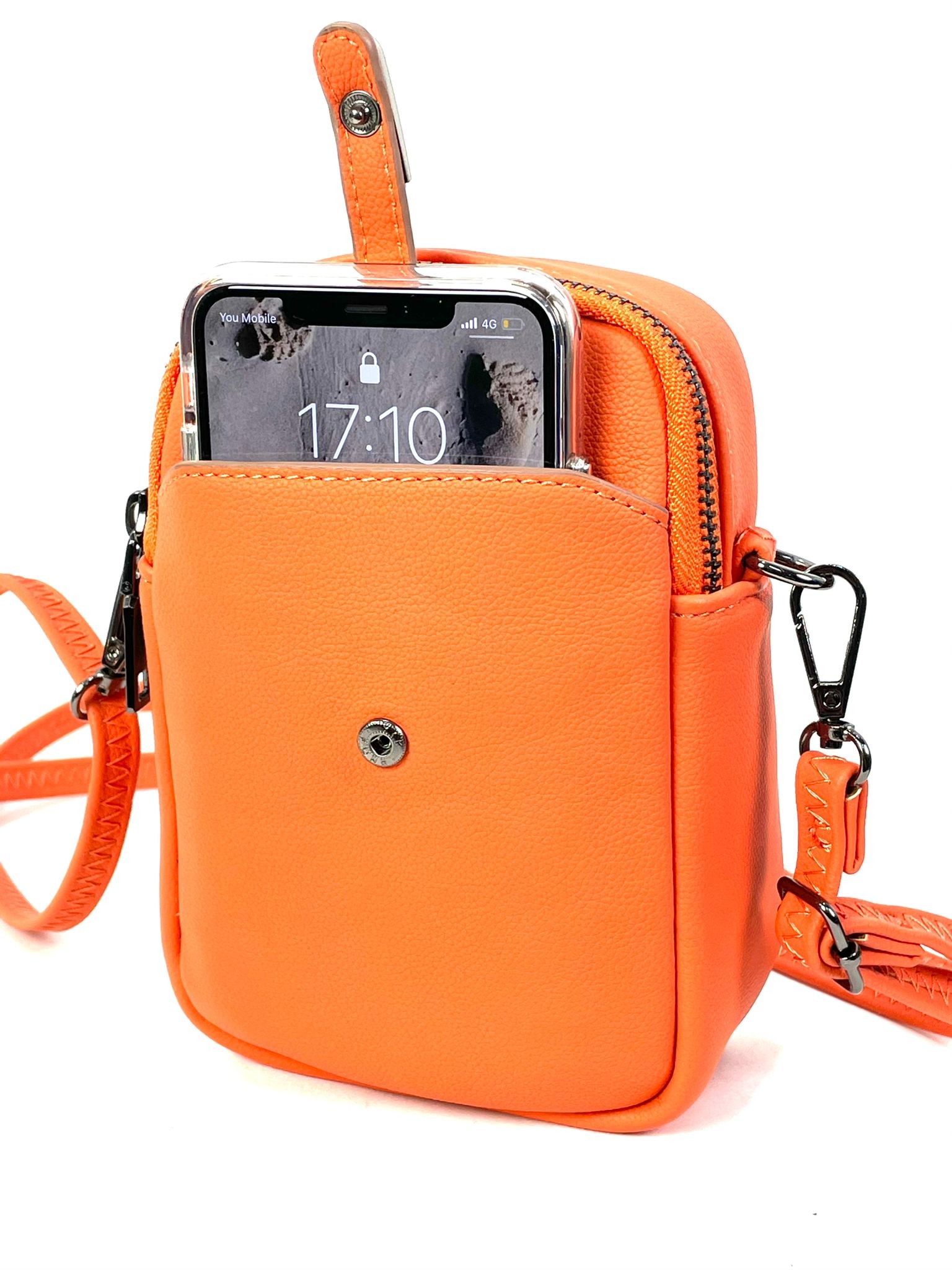 Bolso sintético con compartimentos especiales para móviles, tarjetas y cartera, ideal para mantener todo organizado y a mano.