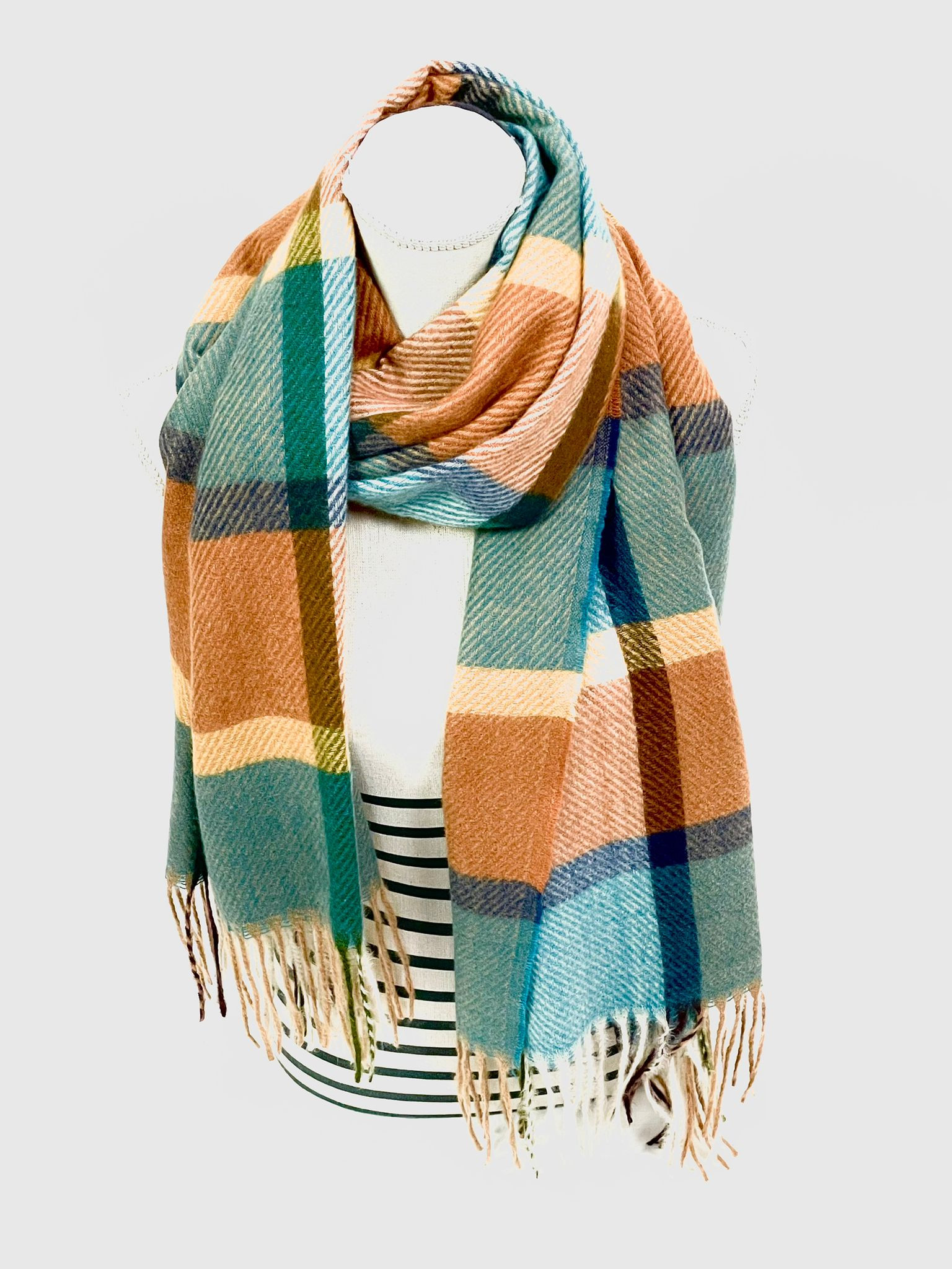 Bufanda confeccionada con una mezcla de lana y viscosa para brindar calidez y suavidad al tacto. Su diseño presenta un estampado a cuadros clásico que añade un toque de estilo atemporal, junto con elegantes flecos en los extremos que le dan un acabado sofisticado. Con unas dimensiones de aproximadamente 200×67 cm, esta bufanda es perfecta para mantenerte abrigado y a la moda en los días fríos. Atrévete a lucir este accesorio versátil y elegante en cualquier ocasión.