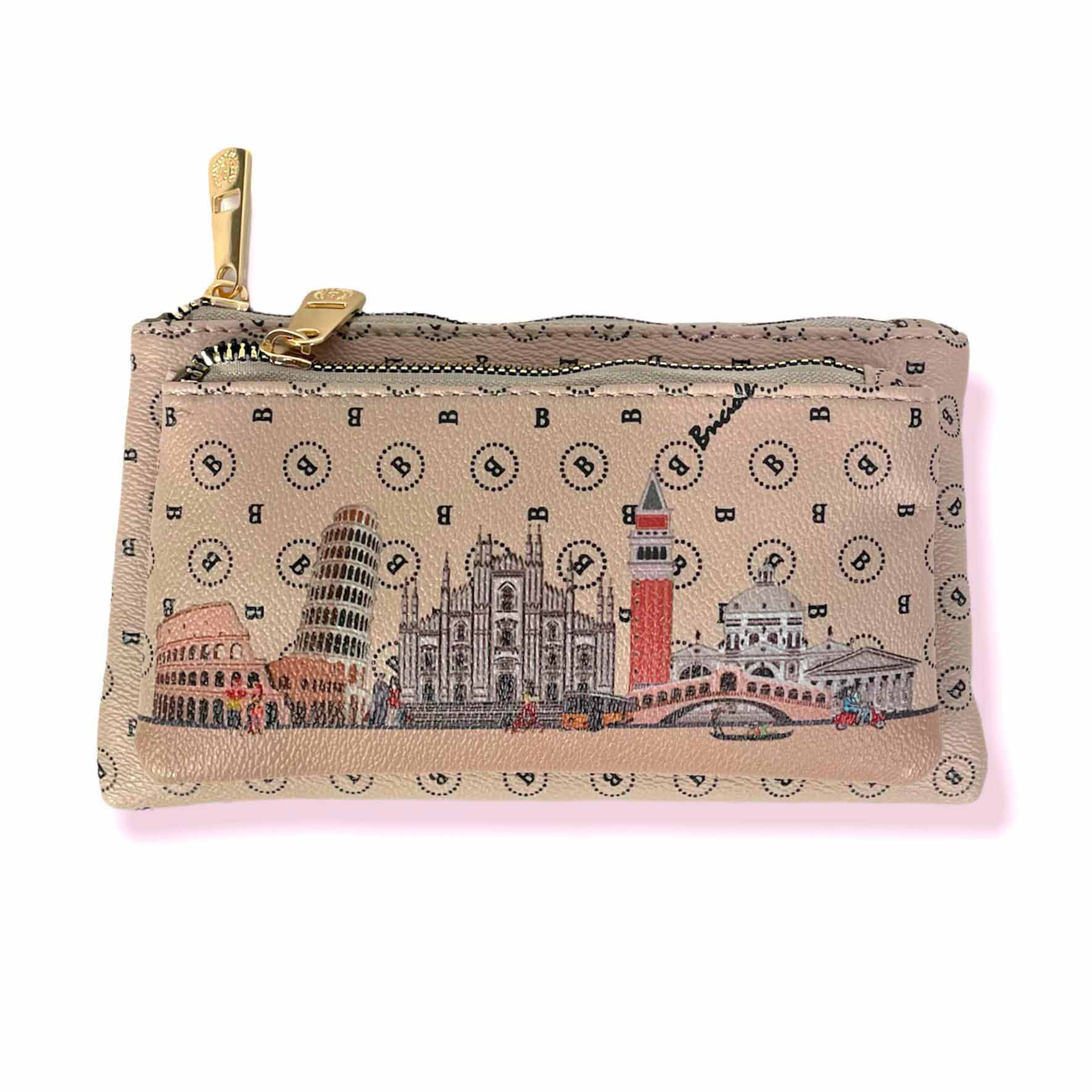 Cartera Monedero sintético y compacto con 2 bolsillos de cremallera y compartimentos interiores.