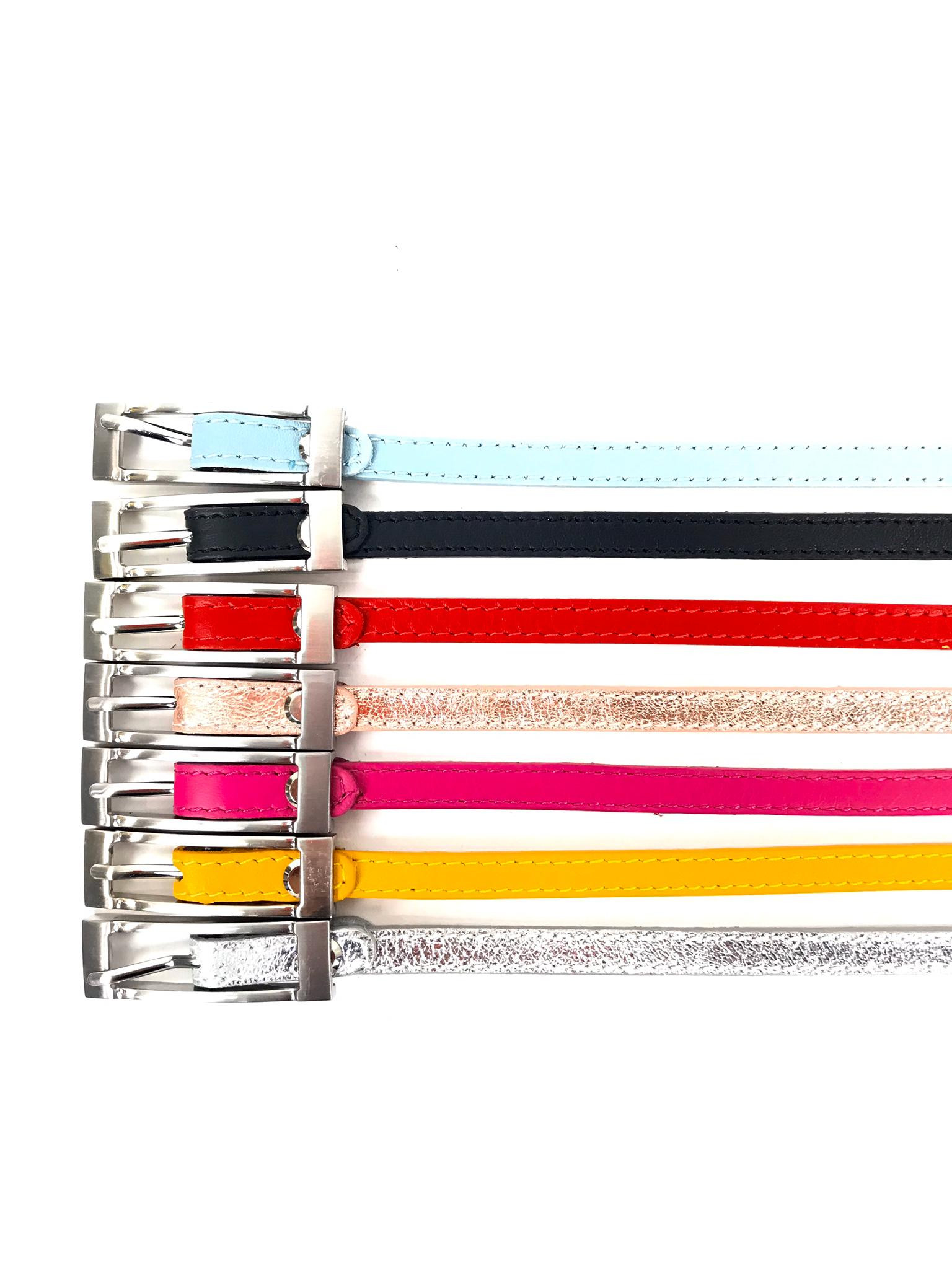 Cinturón delgado con hebilla decorada con colores sólidos. Con un ancho de 1 cm, este cinturón es perfecto para darle un toque de estilo a cualquier atuendo. Disponible en talla única, está confeccionado en piel de vacuno de alta calidad. Fabricado en Italia, este cinturón es sin duda una pieza elegante y sofisticada que no puede faltar en tu armario.