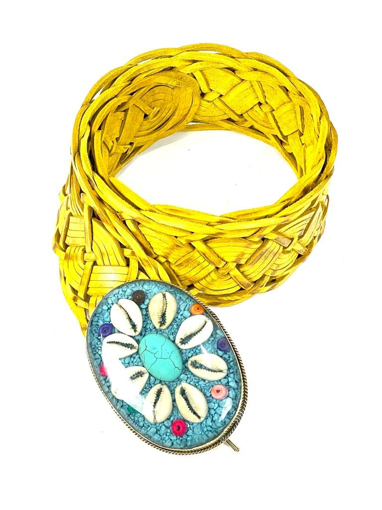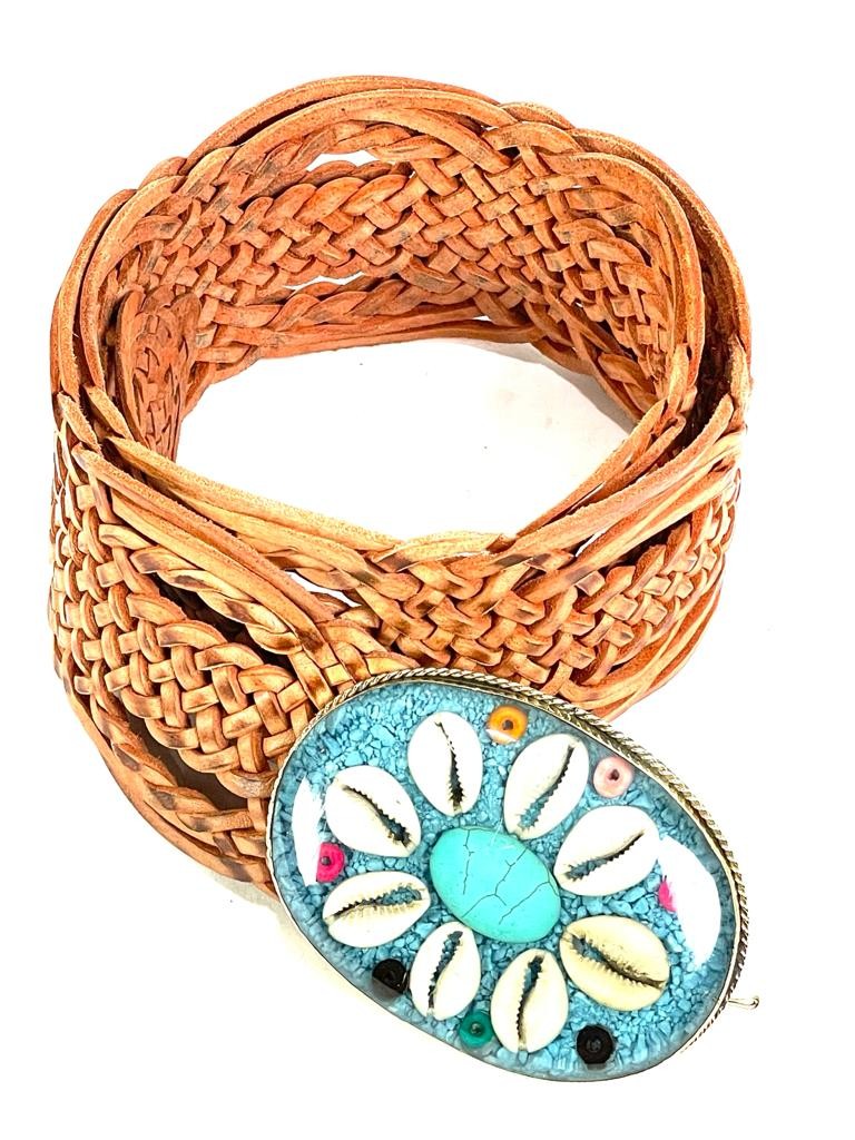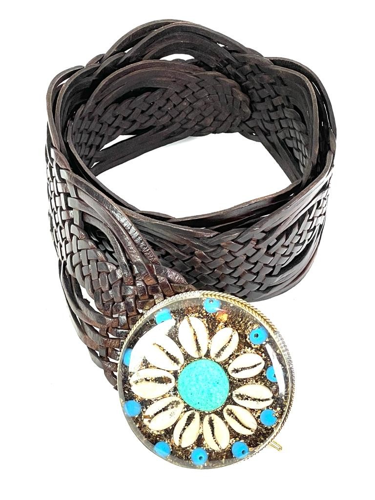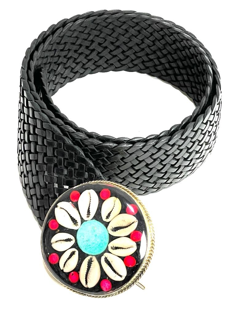 Cinturón de cuero marroquí hecho a mano con una hebilla adornada con conchas marinas de diferentes formas y colores. Cada pieza es única, por lo que puede variar ligeramente de la imagen mostrada.