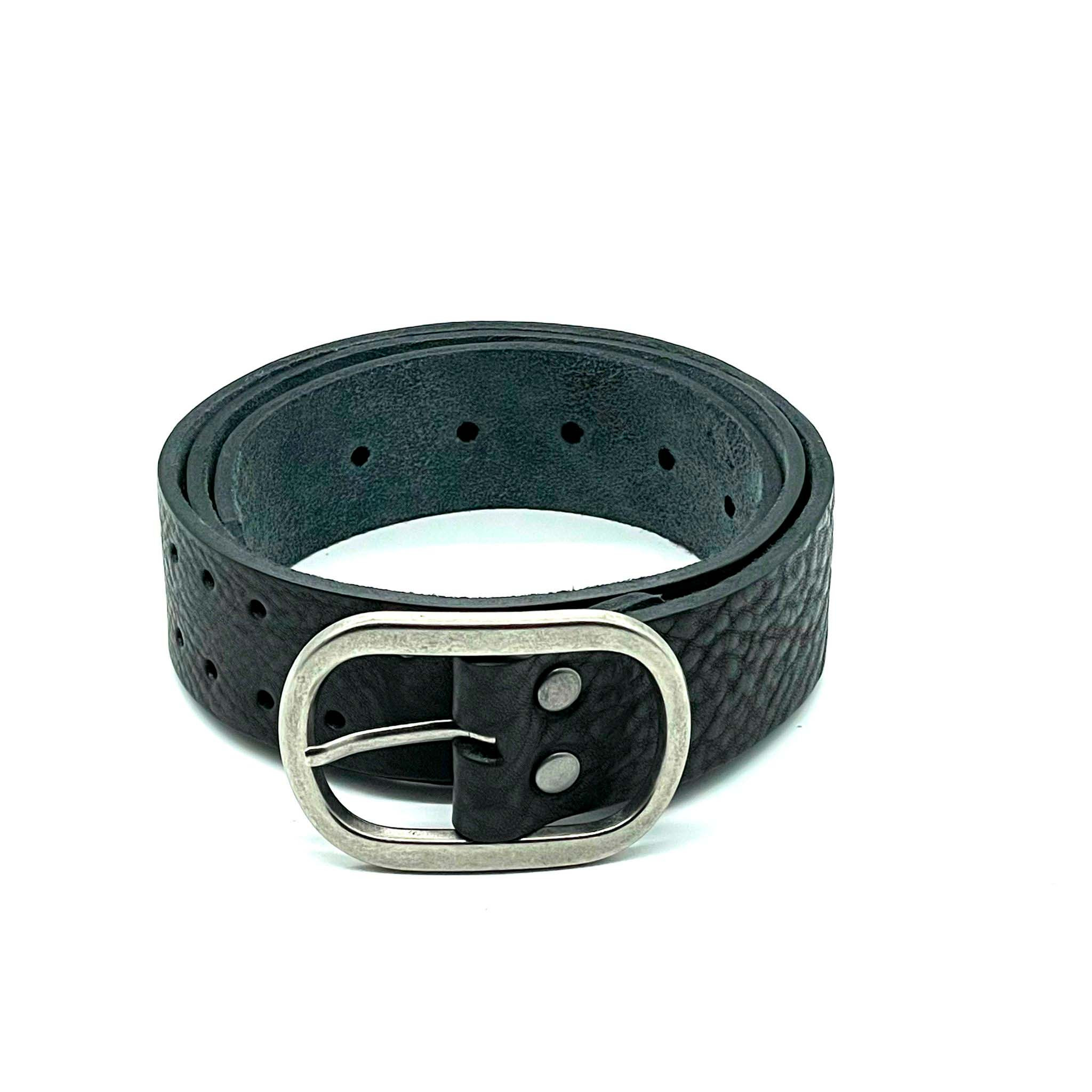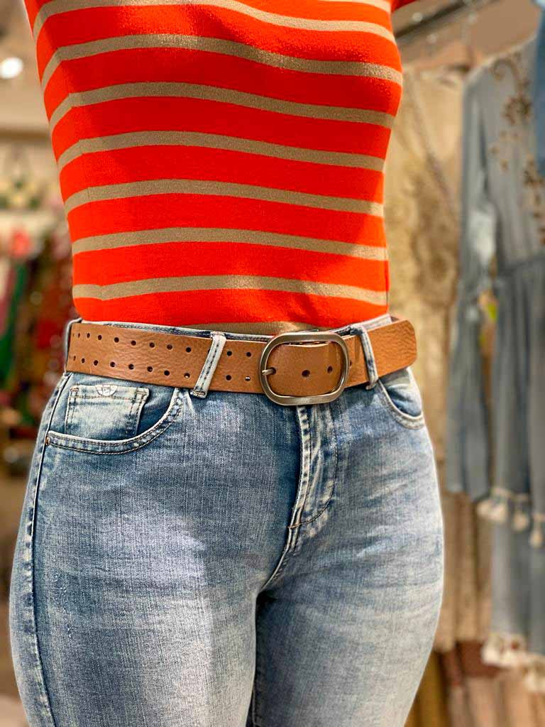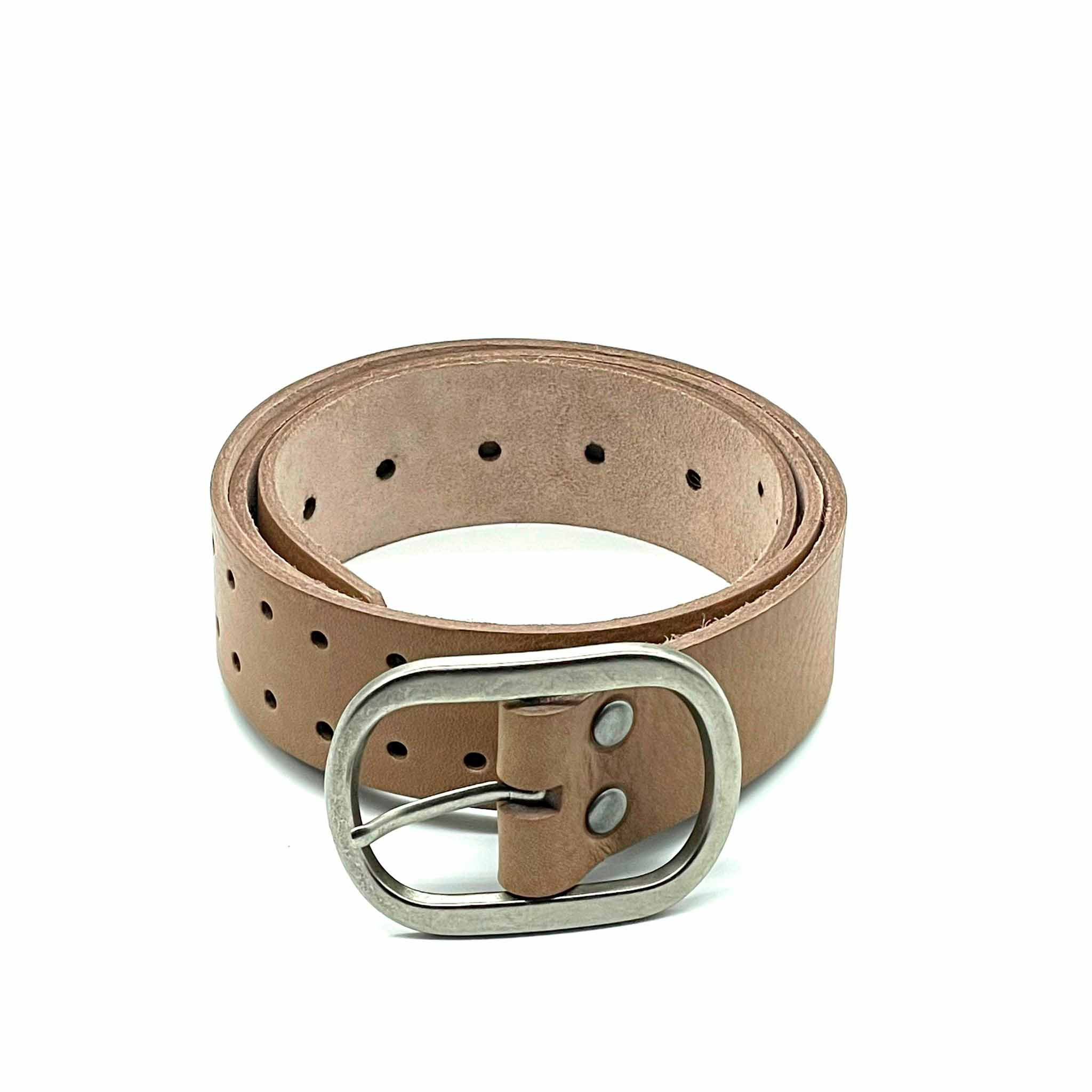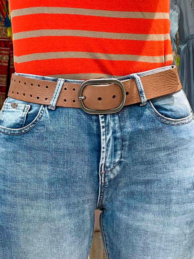 Cinturón de piel de vacuno sostenible y curtición ecológica, fabricado en España. Su diseño clásico con agujeros lo hace muy versátil y fácil de combinar con cualquier outfit.