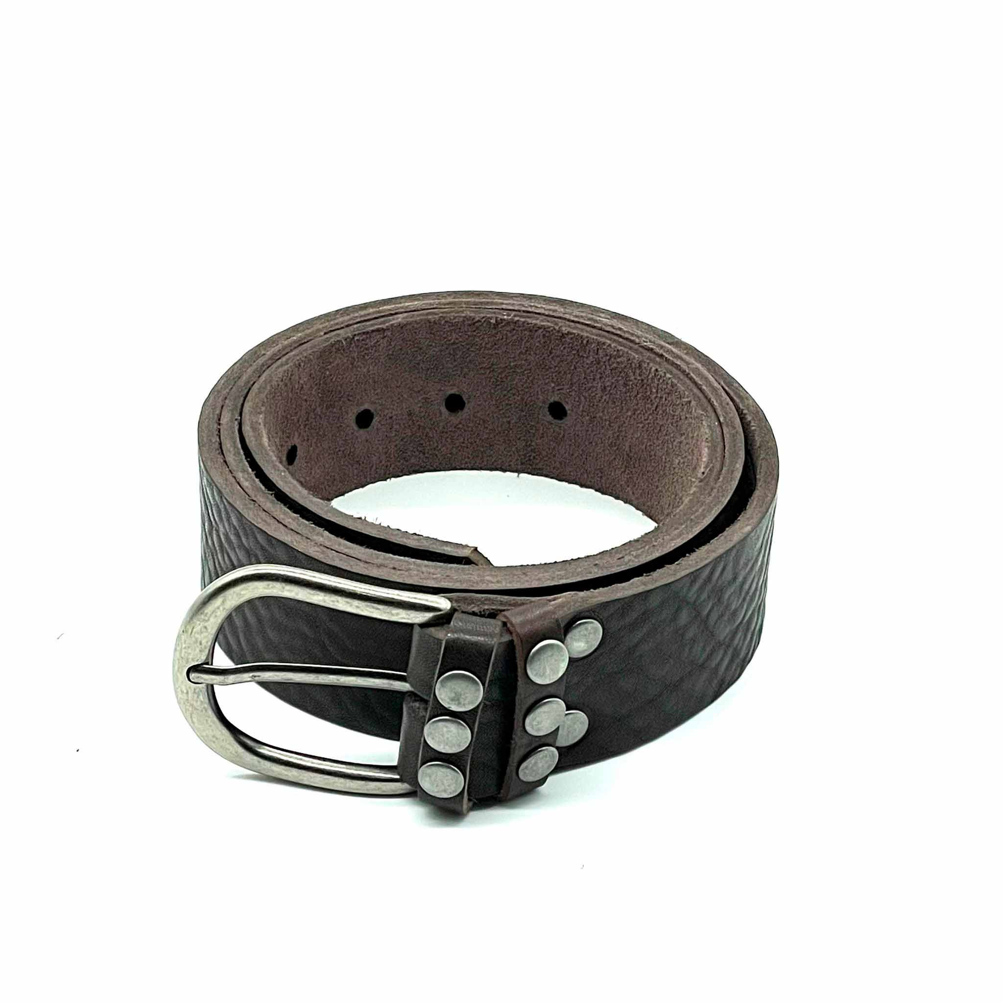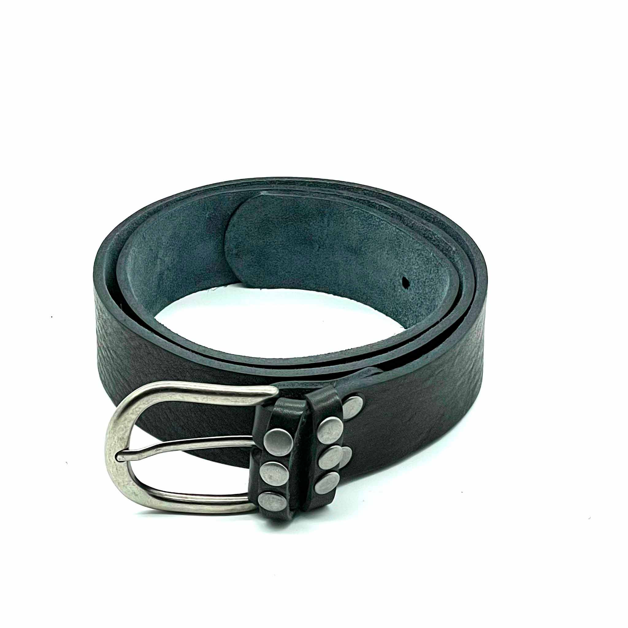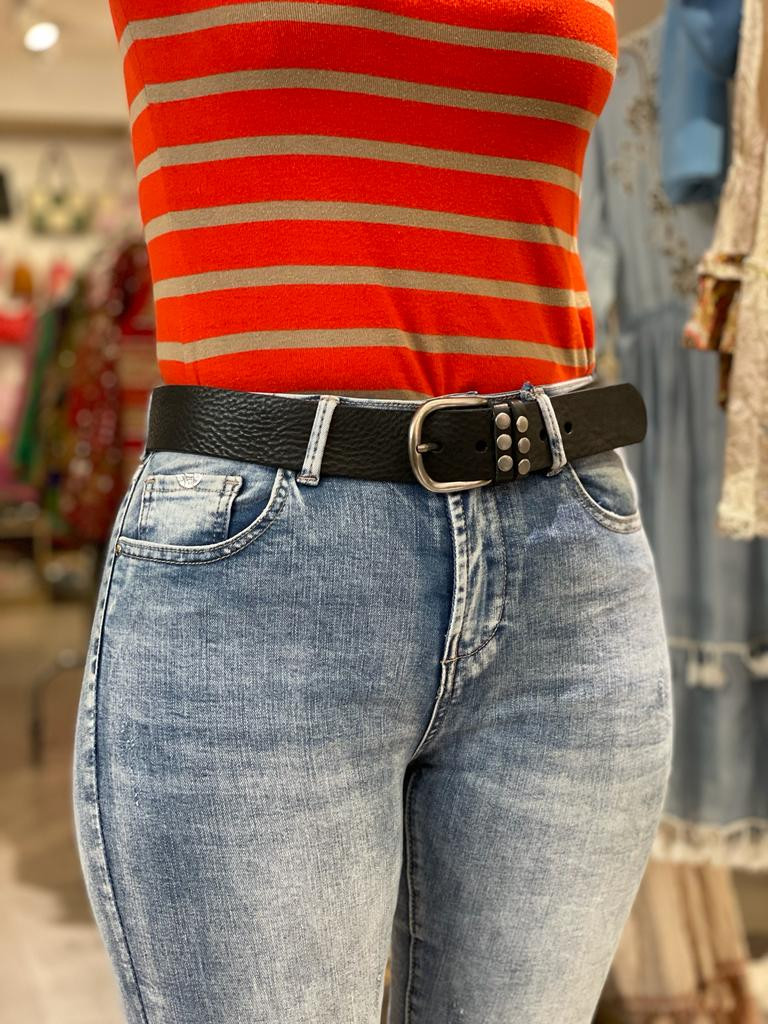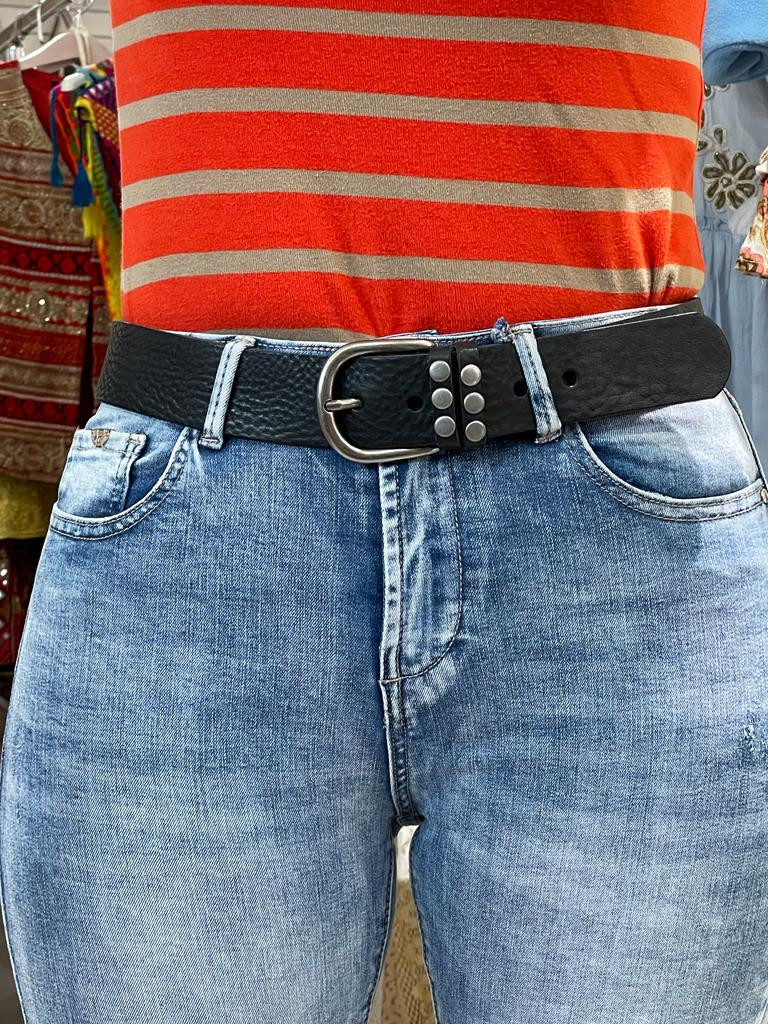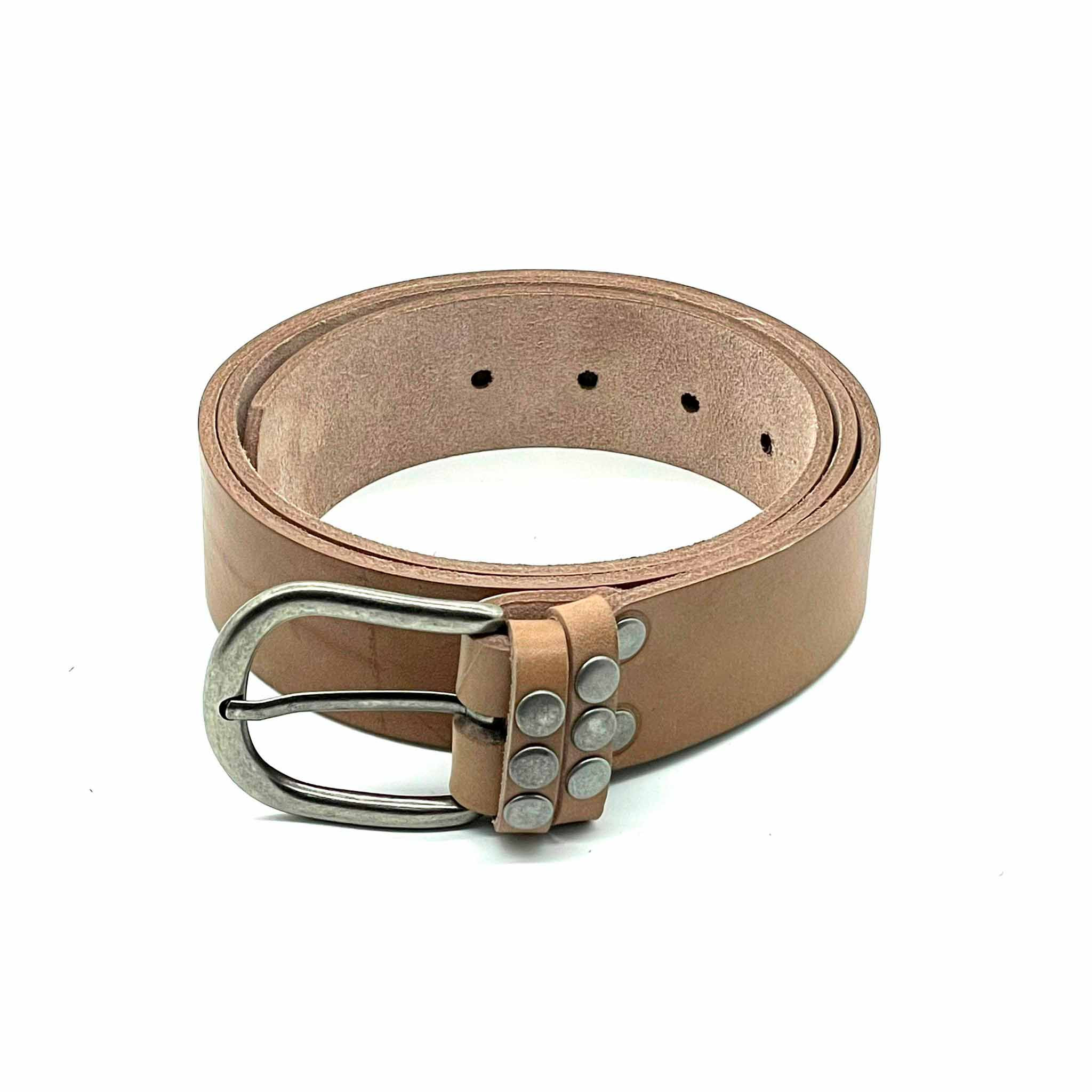 Este cinturón de piel de vacuno sostenible es una pieza artesanal fabricada en España con un proceso de curtición ecológica. Su diseño de tachuelas le da un toque moderno y sofisticado que lo convierte en el complemento perfecto para cualquier outfit.