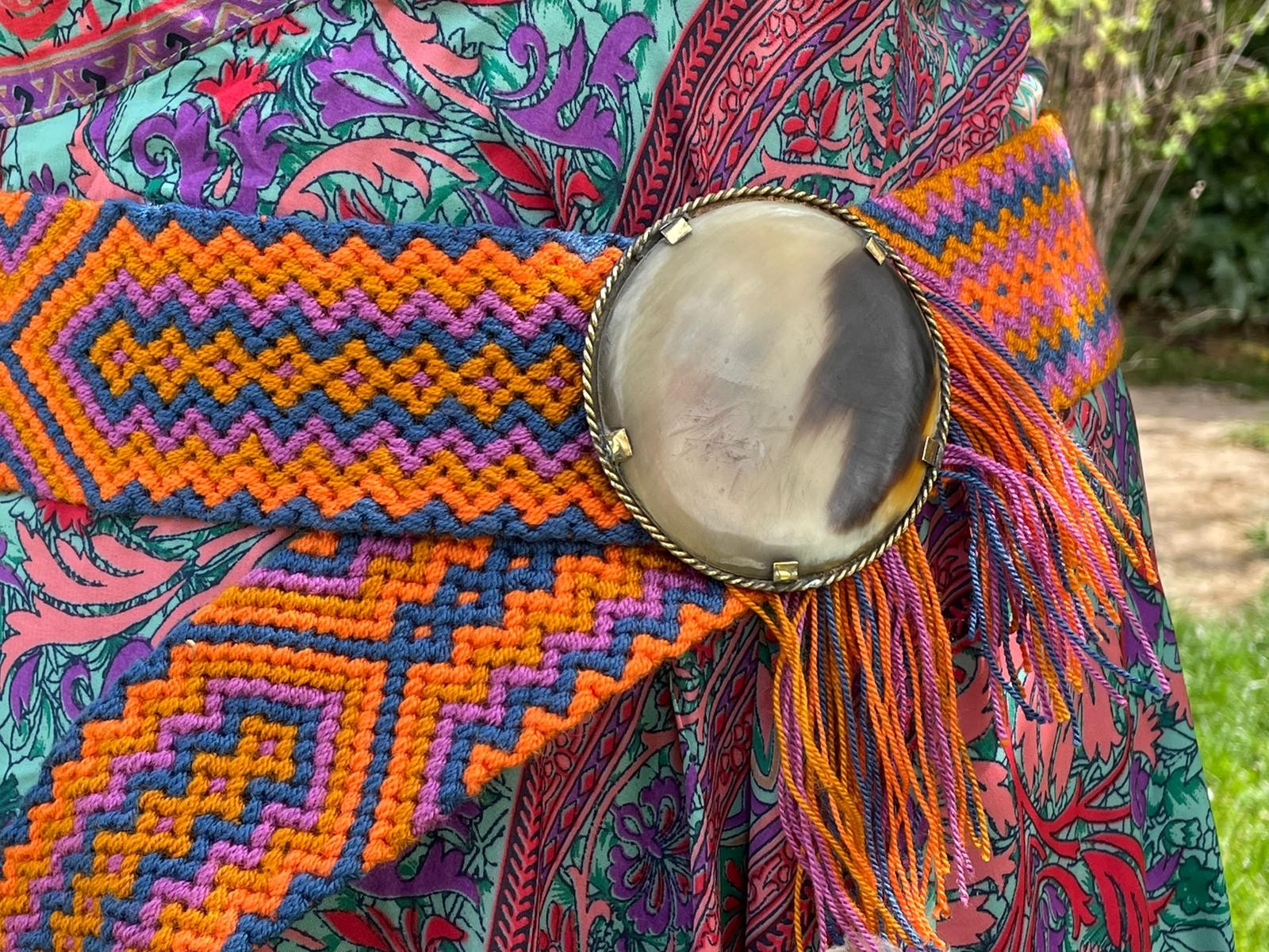 Cinturón artesanal tipo wayuu con una combinación única de colores y chapas artesanales que lo hacen destacar.