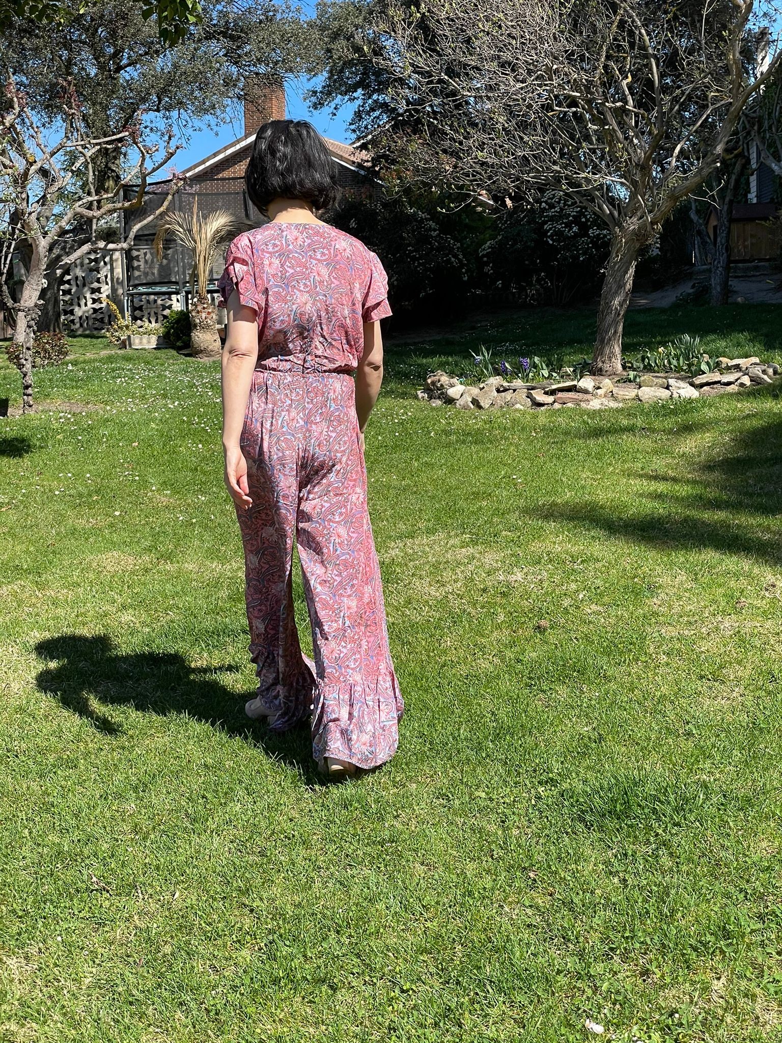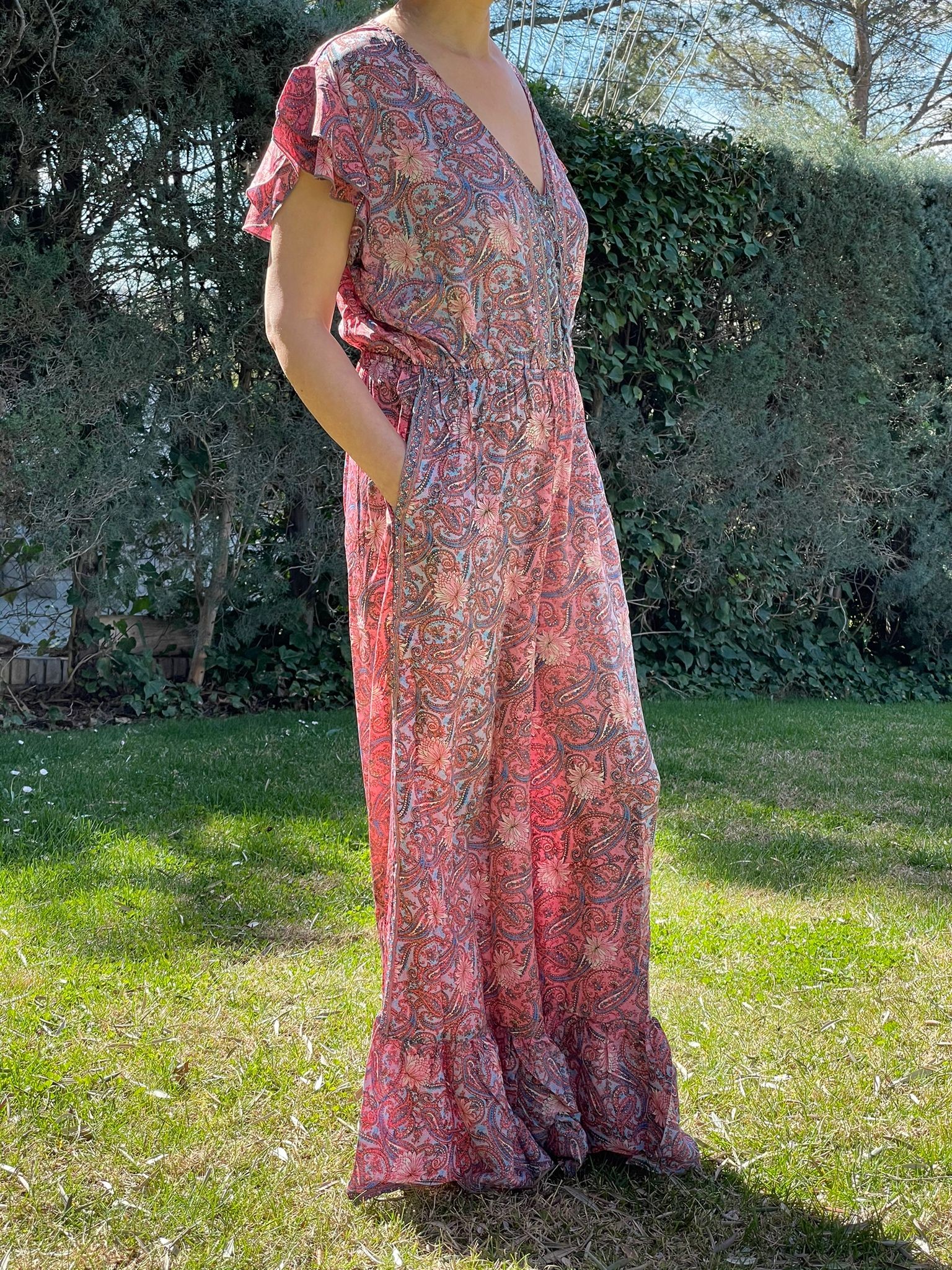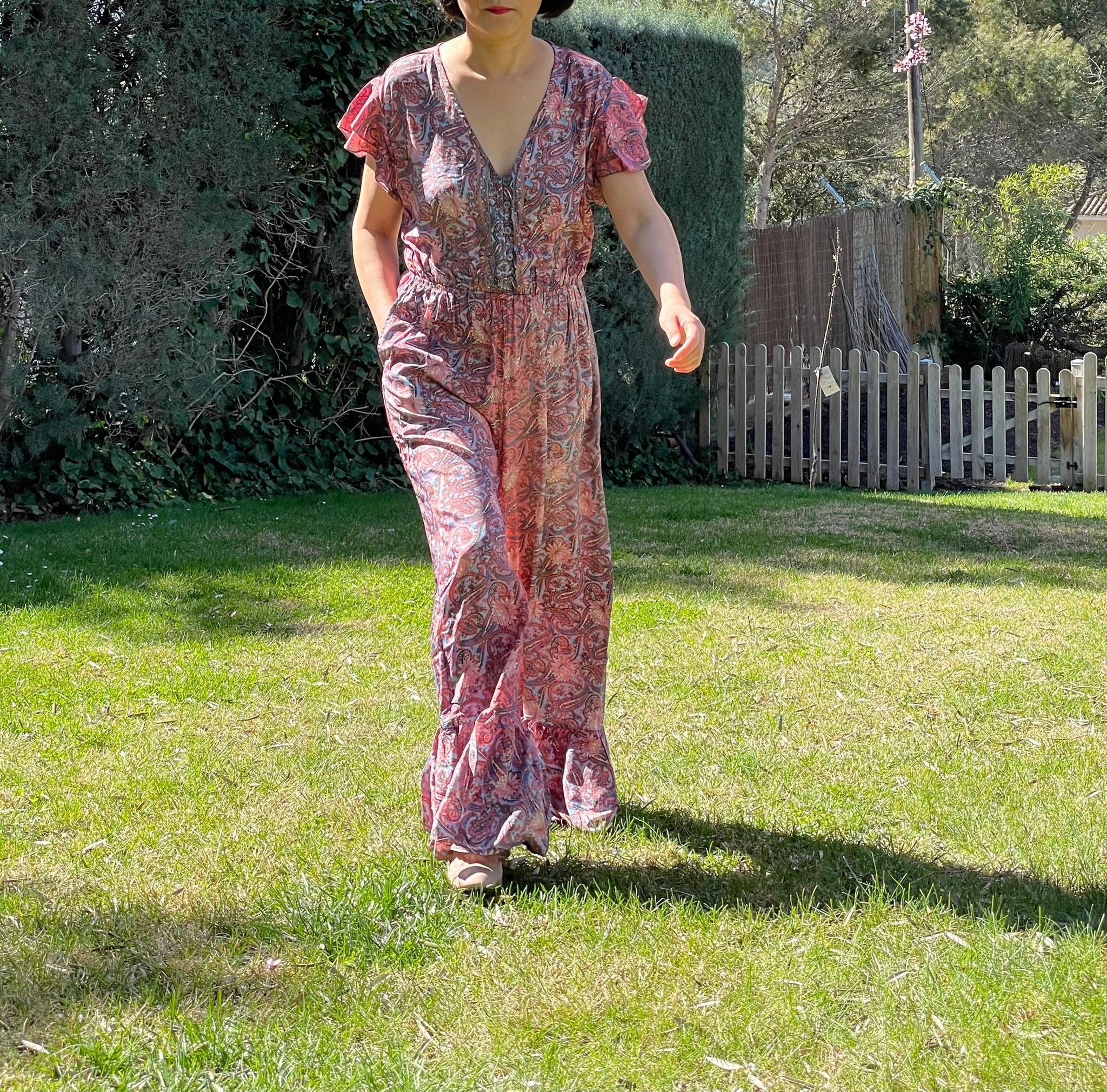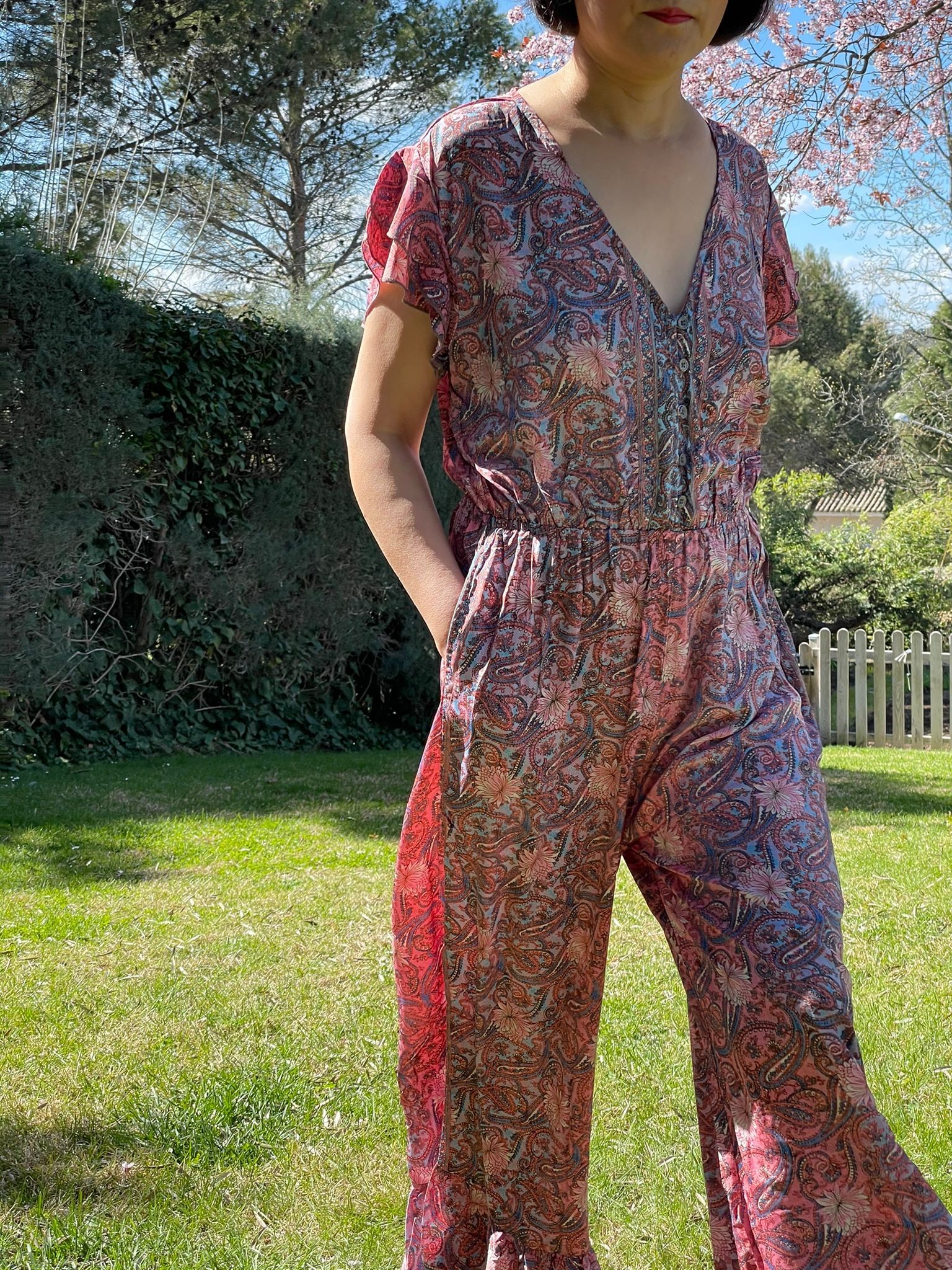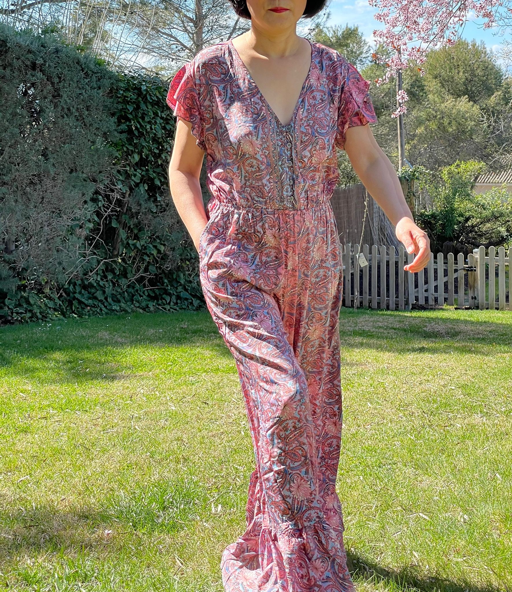 Mono con escote en forma de V y mangas cortas que le dan un toque elegante y femenino.