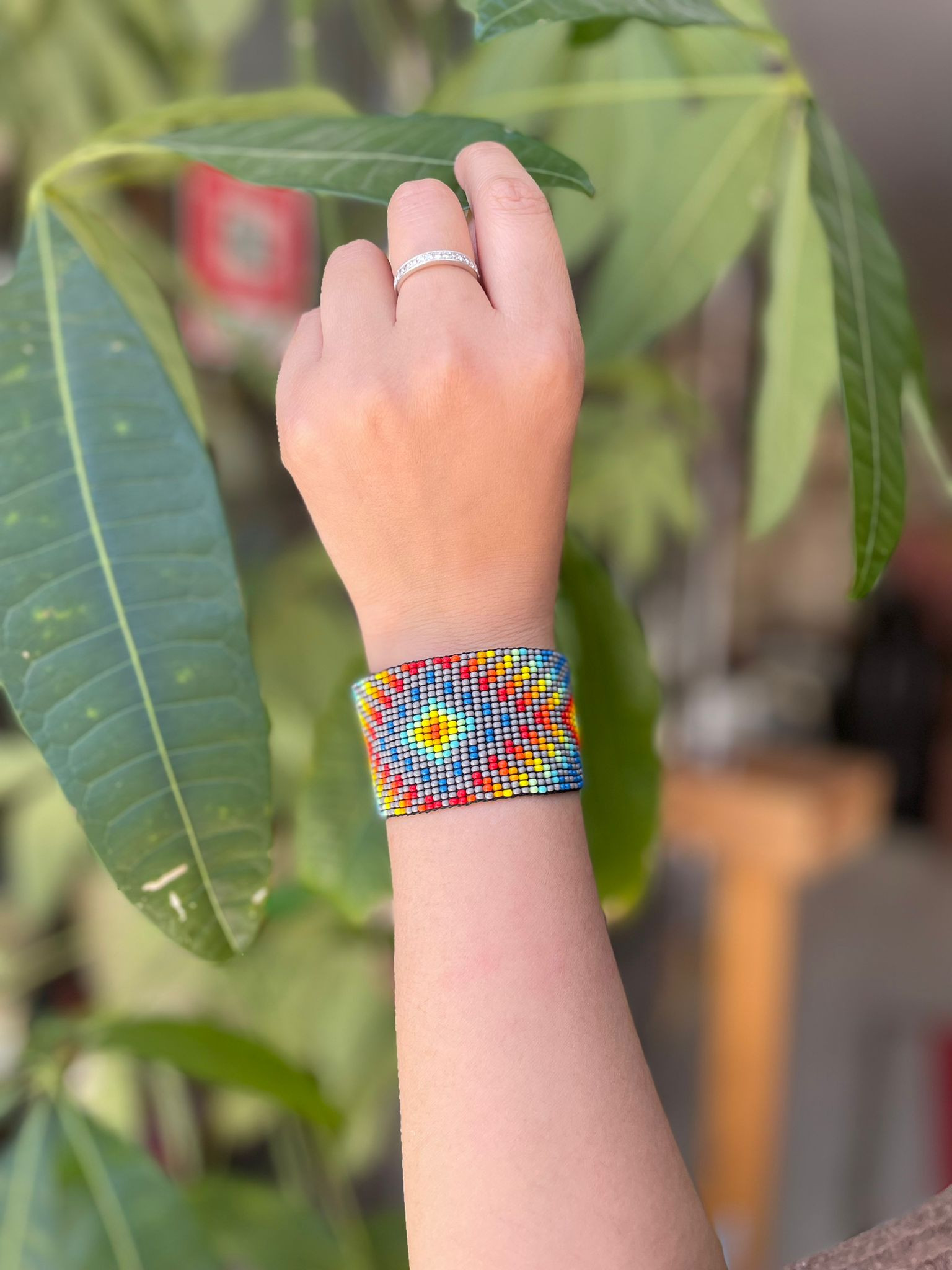 Pulsera artesanal ancha de algodón tipo Wayuu con una amplia gama de colores vibrantes para elegir.