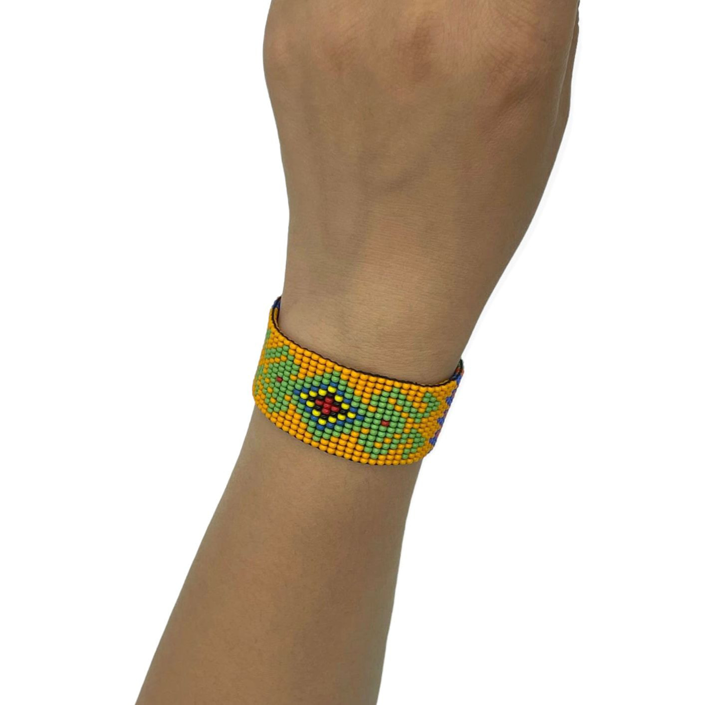 Pulsera étnica y artesanal ancha estilo Wayuu con una combinación de colores hermosa y llamativa.