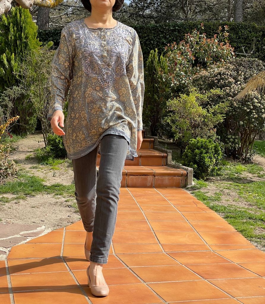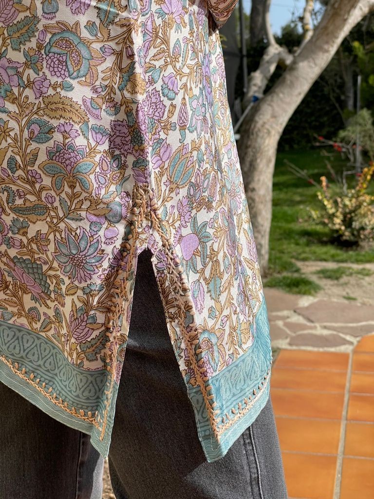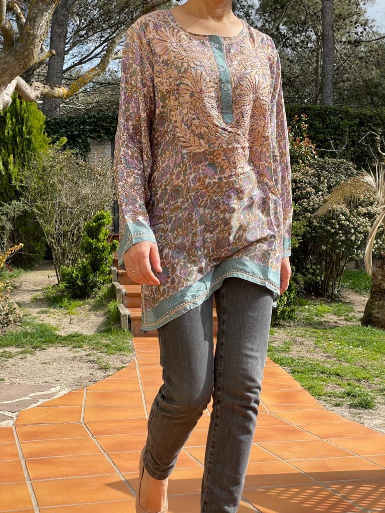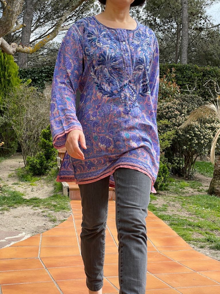 Descubre nuestra exclusiva túnica corta, confeccionada de manera artesanal y bordada a mano con detalles inspirados en la cultura india. Cada pieza es única y especial, ya que no hay dos iguales.