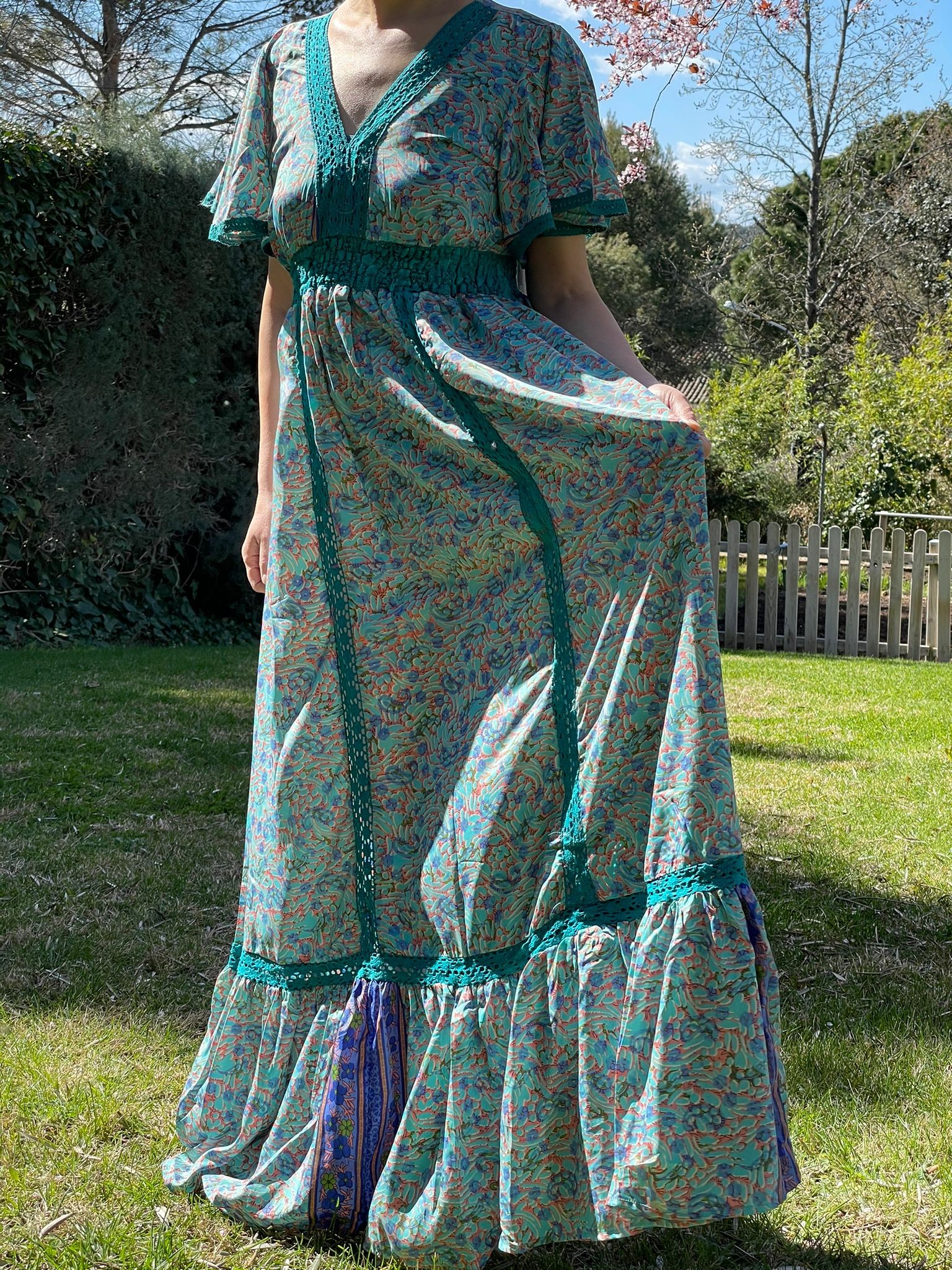 Este hermoso maxi vestido presenta una manga corta circular que le da un toque elegante y femenino. Con un escote en V que realza la figura y un bajo con volante que añade un toque de movimiento y estilo. Ideal para lucir en cualquier ocasión, ya sea de día o de noche. Su diseño versátil lo convierte en una pieza imprescindible en tu armario. ¡No te quedes sin el tuyo!