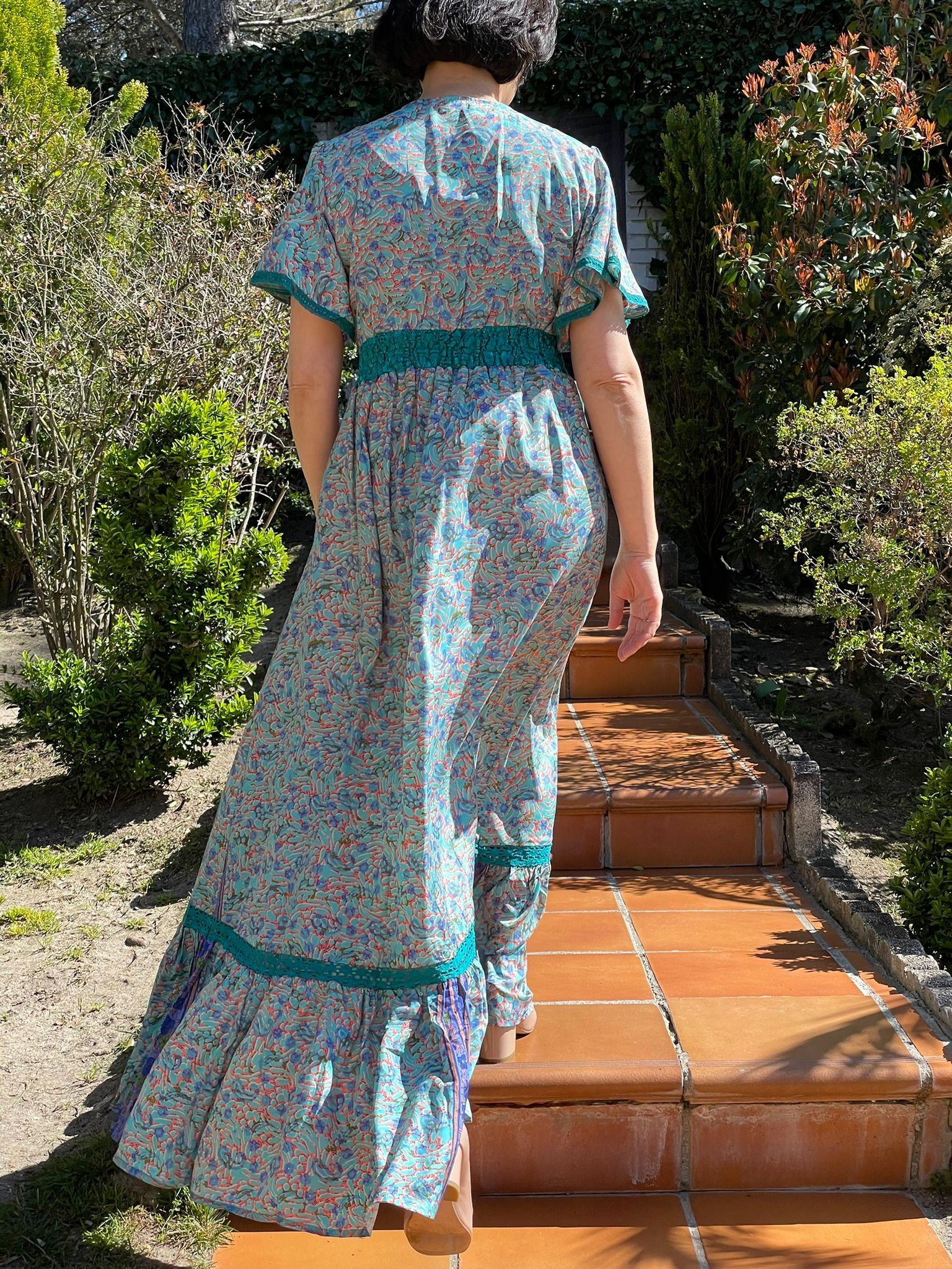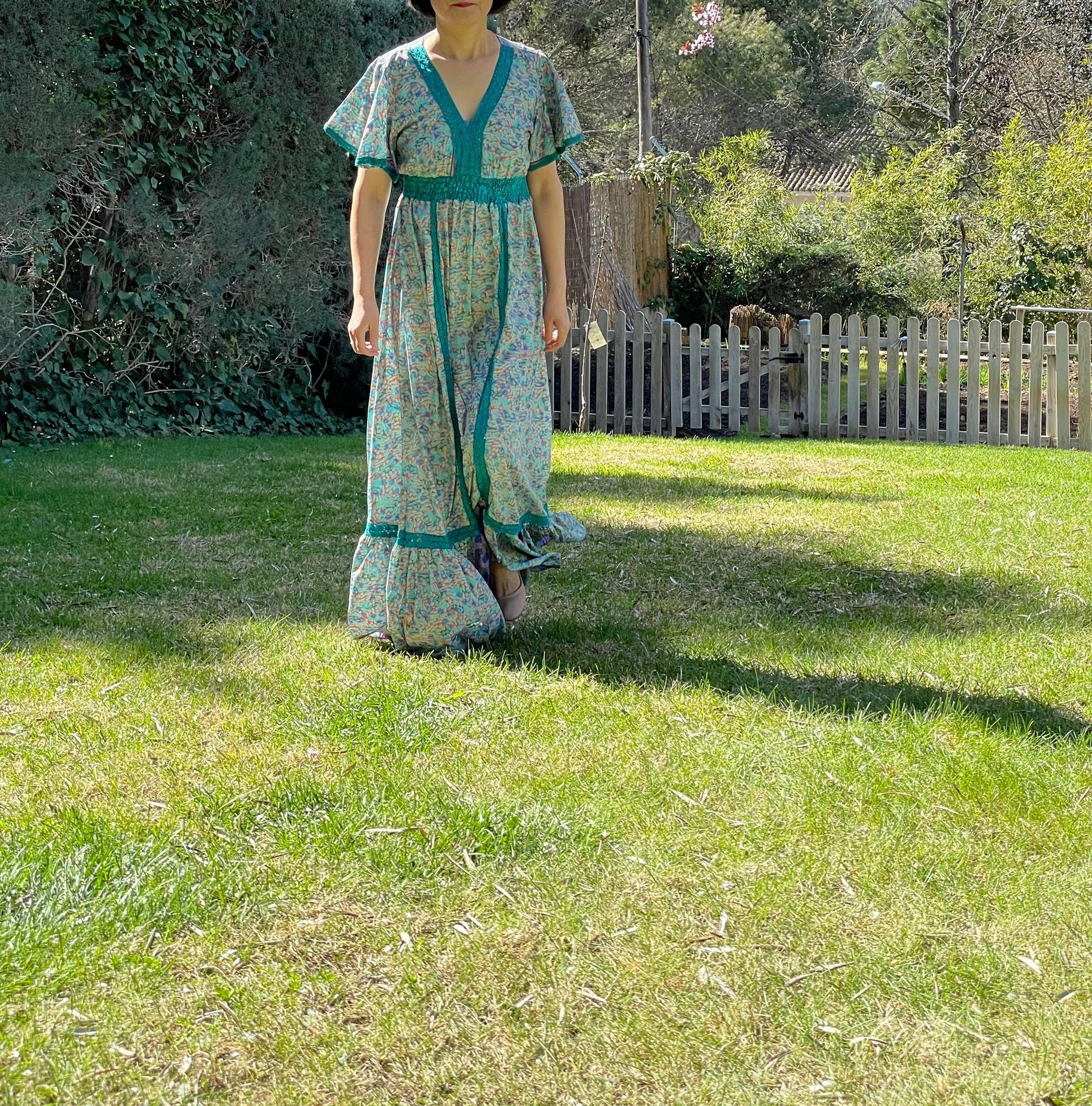 Maxi vestido con manga corta circular, escote en V y bajo con volante