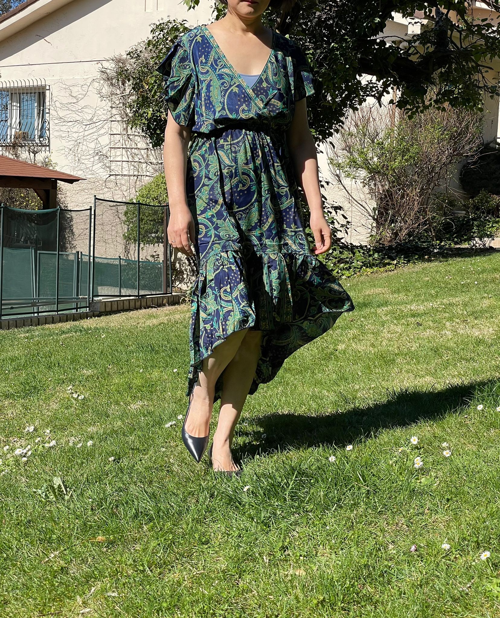Vestido corto con manga corta circular y bajo asimétrico con volante