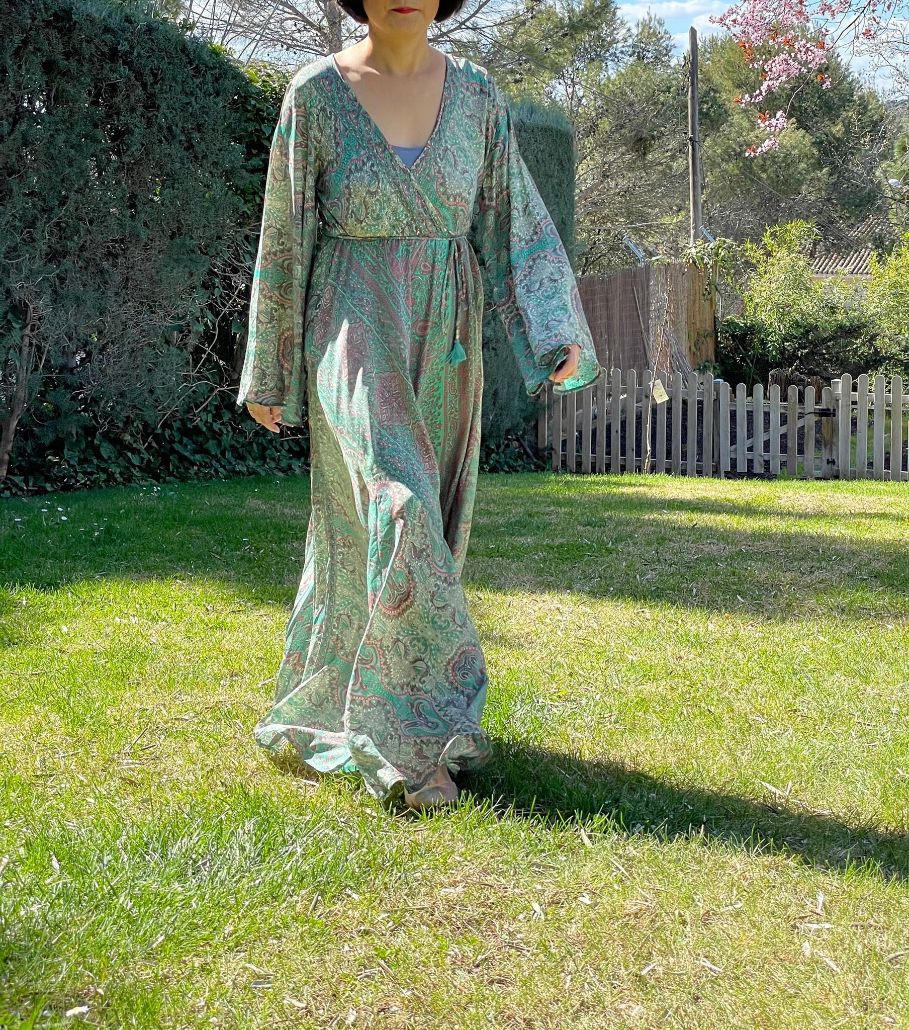 Maxi vestido con manga larga acampanada y escote en V cruzado, ideal para lucir elegante y cómoda en cualquier ocasión.