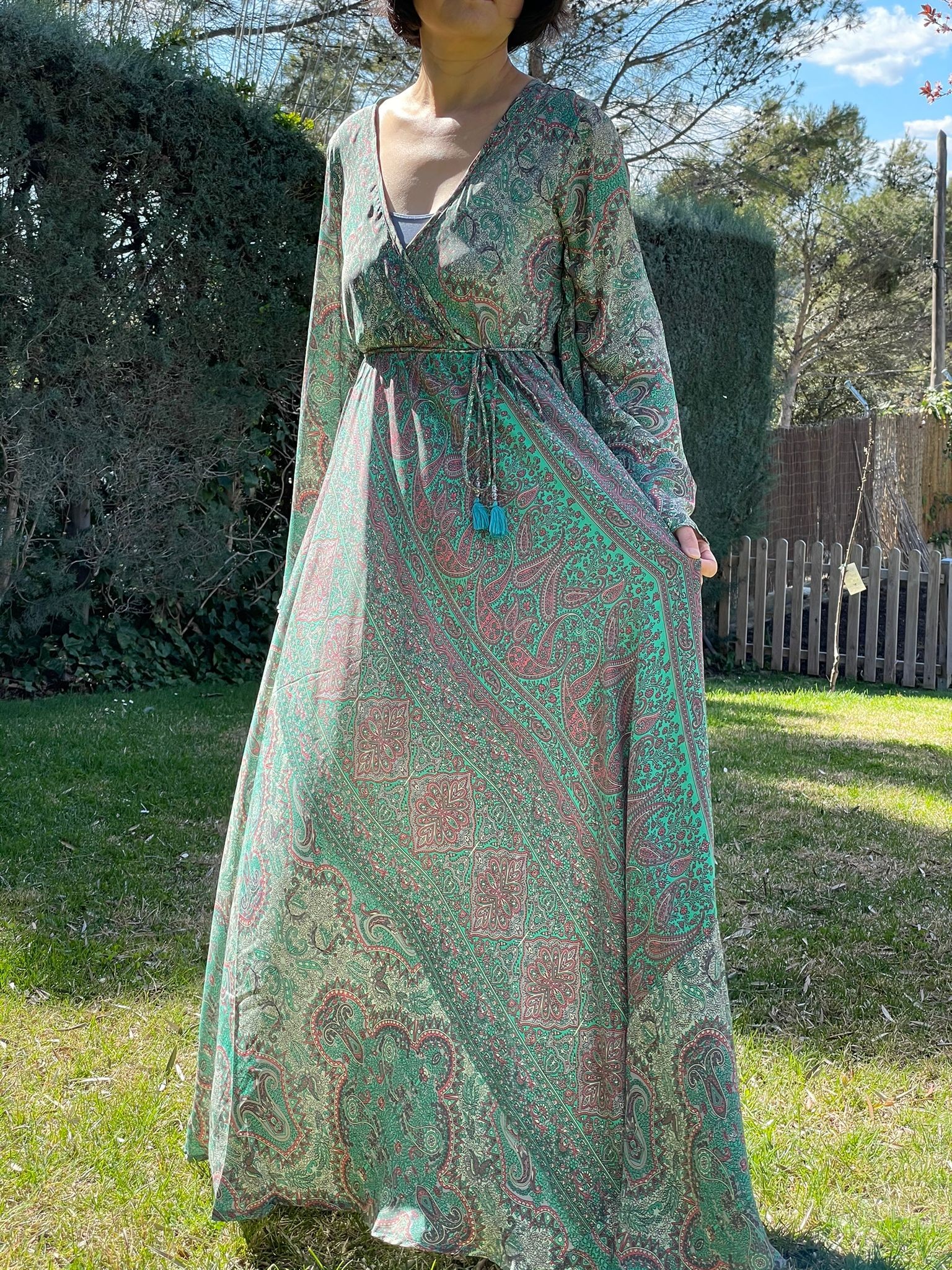 Este hermoso maxi vestido cuenta con mangas largas acampanadas, un escote cruzado en forma de V y un cordón con borlas que se ajusta a la cintura. Confeccionado con telas de alta calidad y un diseño elegante, este vestido es perfecto para cualquier ocasión. Ya sea para una cena formal o una tarde casual, este vestido te hará lucir radiante y a la moda. Atrévete a destacar con este increíble vestido que seguramente se convertirá en una pieza clave en tu armario.