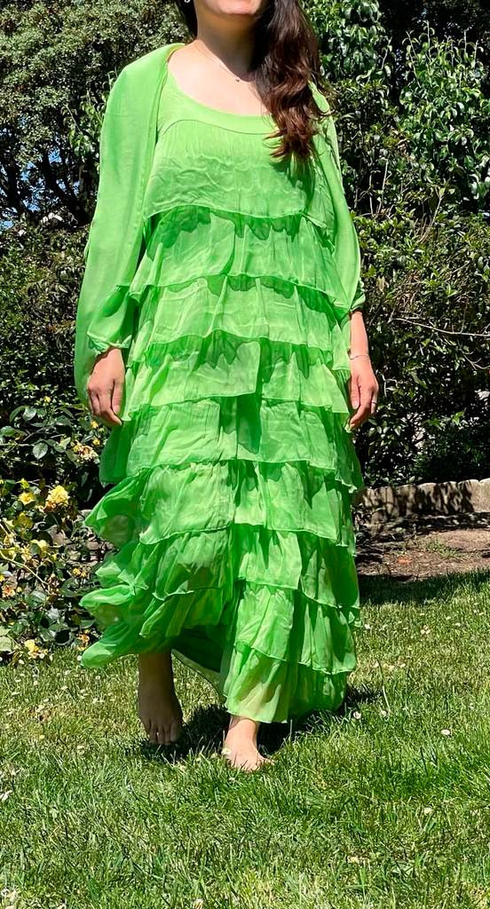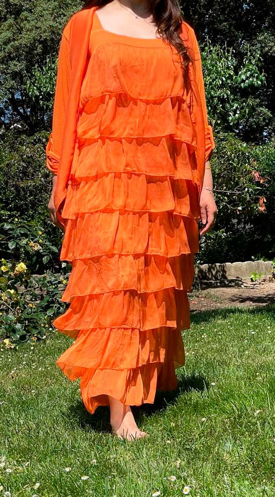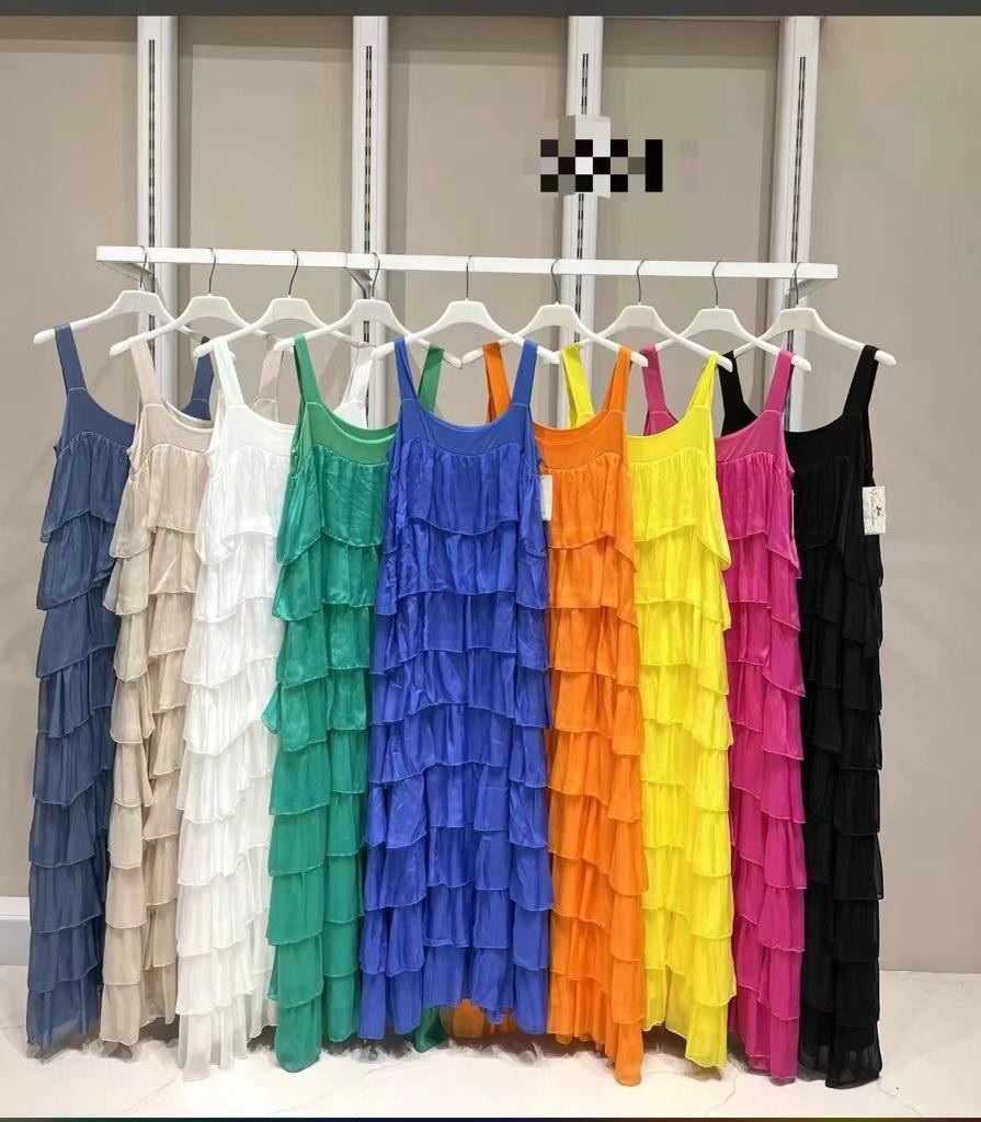 Vestido largo de seda con un diseño escalonado perfecto para lucir en eventos formales o fiestas especiales.